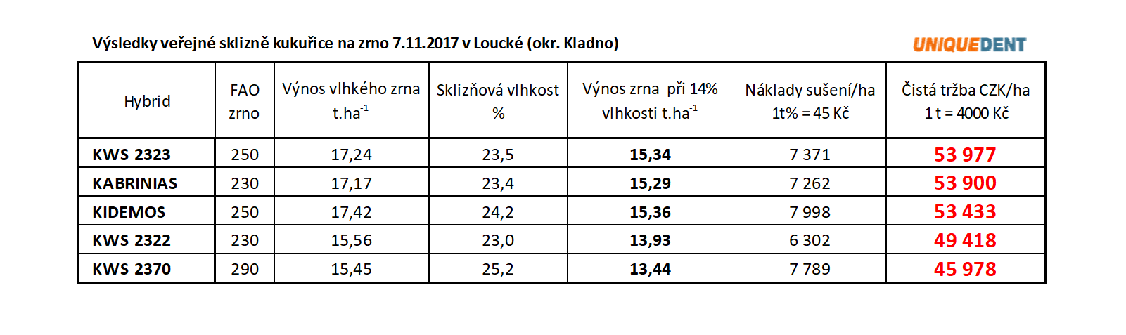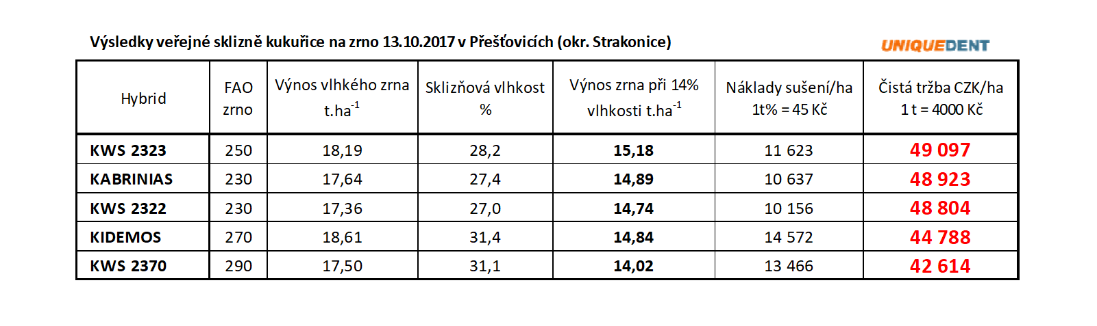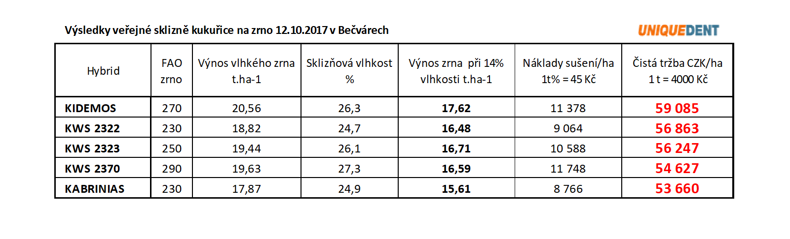 Třetím benefitem, rozhodně tím nejdůležitějším je příznivá výsledná ekonomika výroby suchého zrna hybridů pod značkou „UNIQUE DENT“, což dokládají níže uvedené tabulky z praxe. Lze jednoduše zkonstatovat, že při užití těchto hybridů se vám stane kukuřice na zrno významnou tržní plodinou jednak pro přerušení „úzkých“ osevních postupů a pro zúrodnění půdy vnosem organické hmoty a živin. Dále pro řadu zemědělských firem bude kukuřice na zrno jedinou plodinou, kterou bude možné na jaře 2018 včas zaset, pokud ke konci listopadu 2017 ještě není půda na zimu připravena či zorána pro jarní obiloviny.