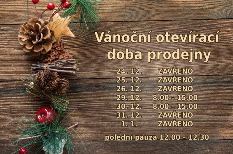 V pondělí 29. 12. a úterý 30. 12. budeme mít otevřeno do 15 h. V běžné otevírací době se na Vás budeme těšit od 2. 1. 2026.