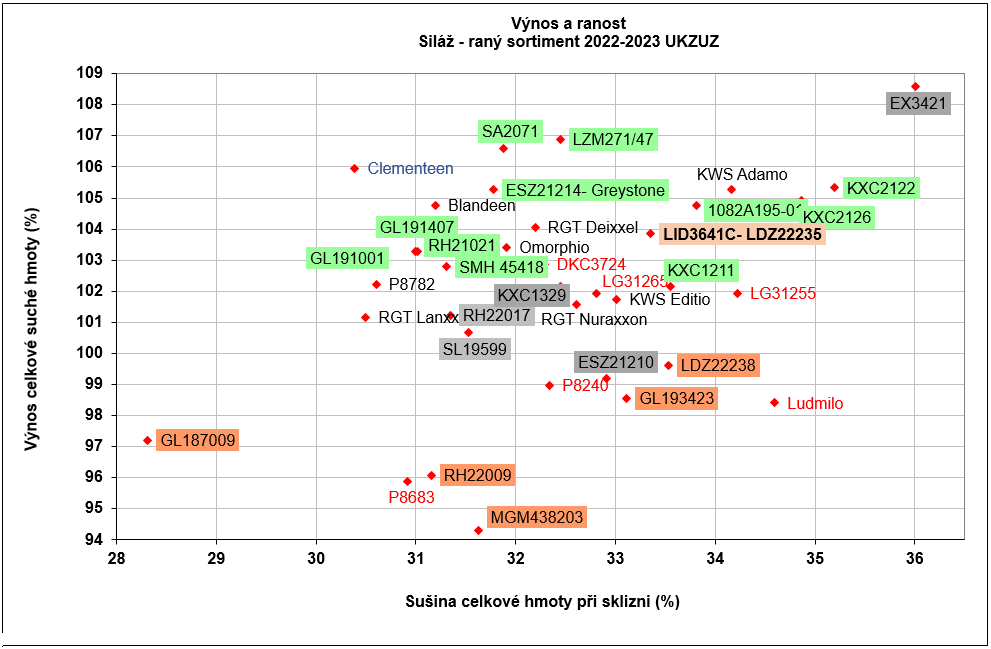 - V ÚKZÚZ v letech 2022-23 dosáhl nadprůměrného výnosu suché hmoty na úrovni 103,8% na kontroly v průměru - viz. graf níže.